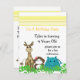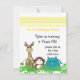 Célébrez l'anniversaire de votre enfant avec ces invitations pour l'anniversaire d'un animal de zoo. Grande girafe souriante, singe mignon et hippopotame bleu sucré accentuent ce design amusant. Customisez avec toutes les informations de votre parti selon vos besoins. Une bordure rayée jaune accentue le sommet et des vignes vertes courent le fond.